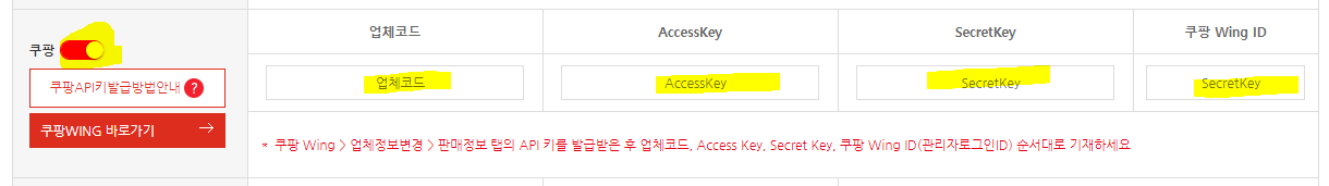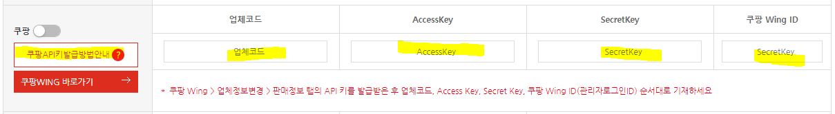 5. 마찬가지로 쿠팡API키발급방법안내를 누르면 설명 볼수있고요. 동일한 방법으로 따라해보겠습니다. 쿠팡은 업체코드, AccessKey, SecretKey, 쿠팡 Wing ID 가 필요하네요.