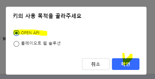 7. 그럼 키의 사용 목적 팝업이 뜨는데 OPEN API를 선택 확인을 눌러줍니다.
