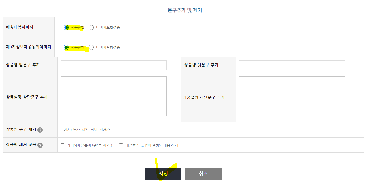 문구추가 및 제거에서는 추가하고 싶은게 있으면 입력을 하시고 이미 스마트스토어에 자동 입력이 세팅되어 있다면 전부 사용안함으로 체크하고 저장 해줍니다.
