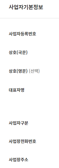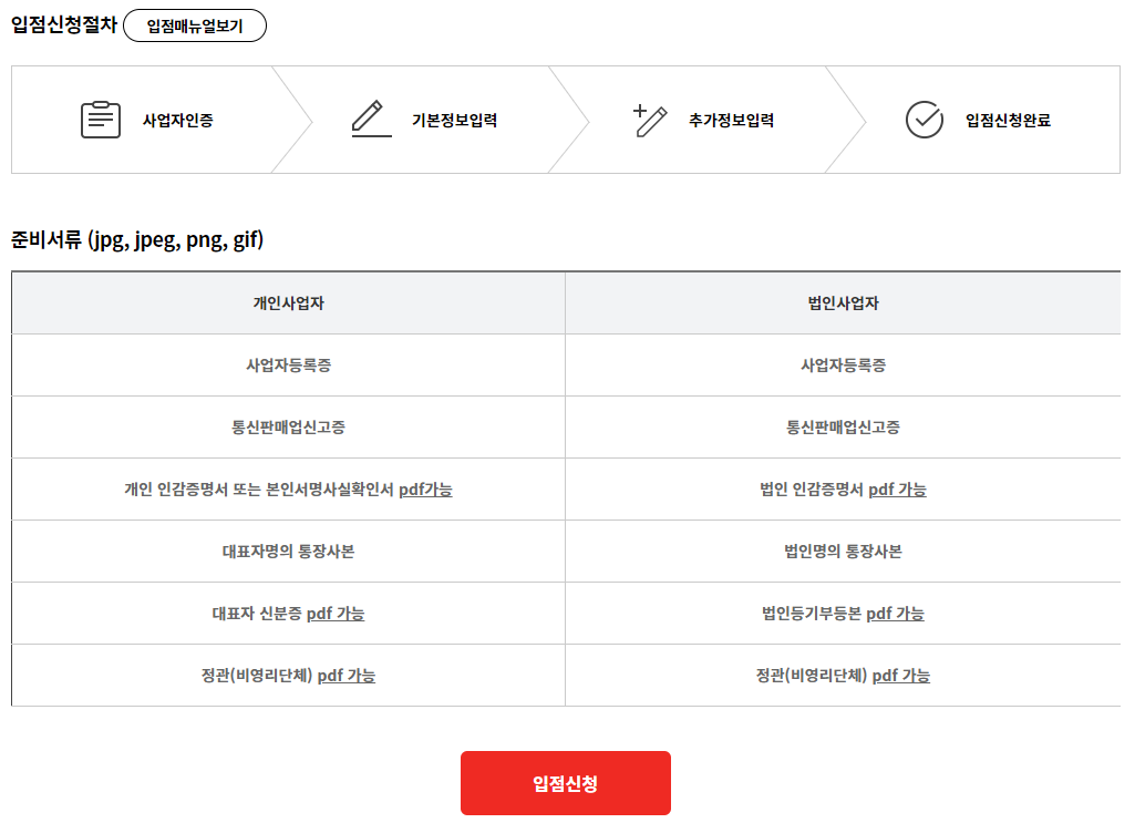 사업자등록증, 통신판매업신고증, 대표자명의 통장사본, 개인인감증명서 또는 본인서명사실확인서, 대표자신분증 이렇게 5가지가 필요하고 차례대로 선택약관동의, 기본정보확인, 추가정보확인 등을 입력 후 저장하면 되겠습니다.