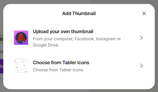 15. 그러면 아래와 같은 화면이 나오는데 Upload your own thumbnail을 클릭하면 본인 소유의 사진을 업로드 가능하고 Choose from Tabler Icons를 클릭하면 링크트리에서 기본적으로 제공하는 아이콘 중에 선택이 가능합니다.