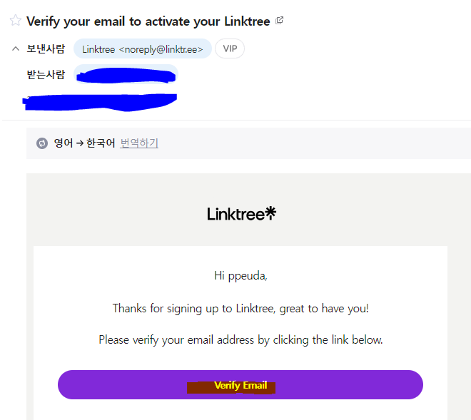 12. 그리고 가입시 입력한 메일함에 들어가면 링크트리에서 아래와 같이 메일을 보낸 것을 확인 할수있어요. Verify email을 클릭해서 인증을 마칩니다.