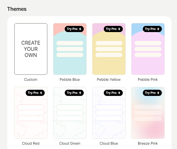 18. 그리고 아래로 내려보면 배경이 되는 테마도 고를 수 있습니다. Try Pro라고 적힌 것들은 유료이니 안적힌 것들 중 무료로 고를 수 있어요. 테마를 클릭하면 오른쪽으로 프리뷰 미리보기 가능하니 보면서 마음에 드는 디자인으로 고르면 되겠습니다.