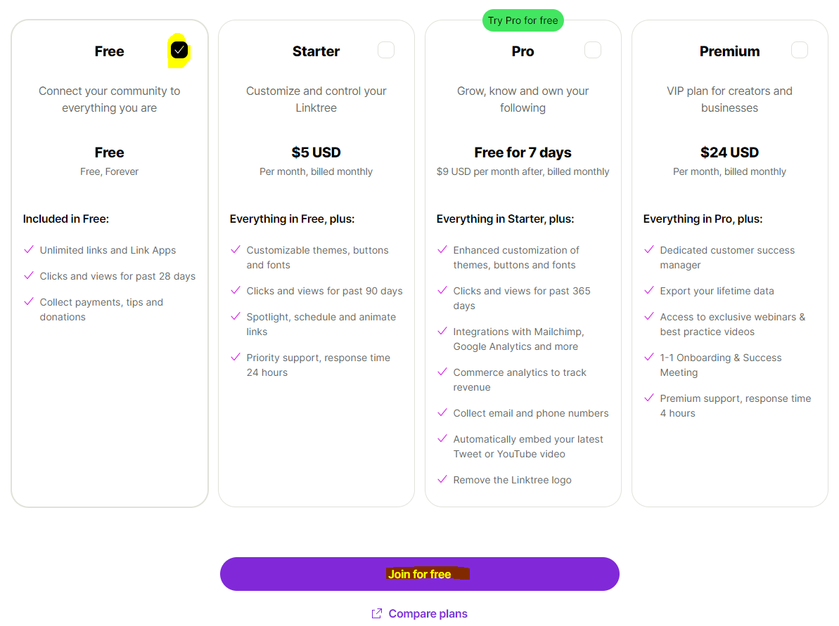 10. 요금제가 나오는데 무료로 사용할 거라 Free에 체크를 하고 Join for free를 클릭합니다.
