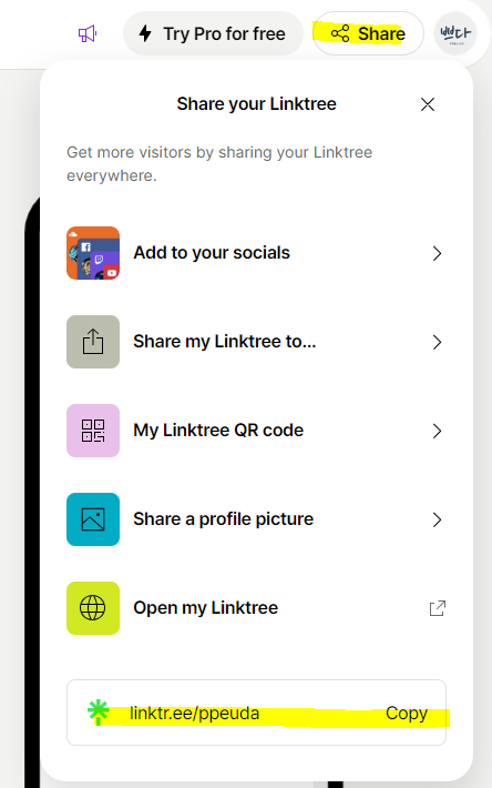 20. 링크트리를 다 만들었으면 최종 점검을 해보면 되는데요. 맨 위의 오른쪽 Share 버튼을 누르면 아래에 나의 링크트리 주소가 나옵니다. Copy를 눌러서 새 인터넷창을 띄워 주소 붙여넣기하여 맞게 들어가는지 링크별 클릭 확인 해봅니다.