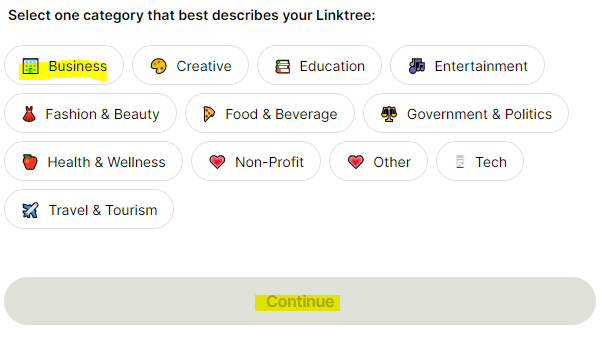 6. 그러면 아래와 같은 화면이 나오는데 링크트리를 설명하는 카테고리를 선택하면 되는데 아무거나 선택해도 무관합니다. 사업체면 Business를 선택해주면 되겠습니다. 선택하고 Continue를 클릭합니다.