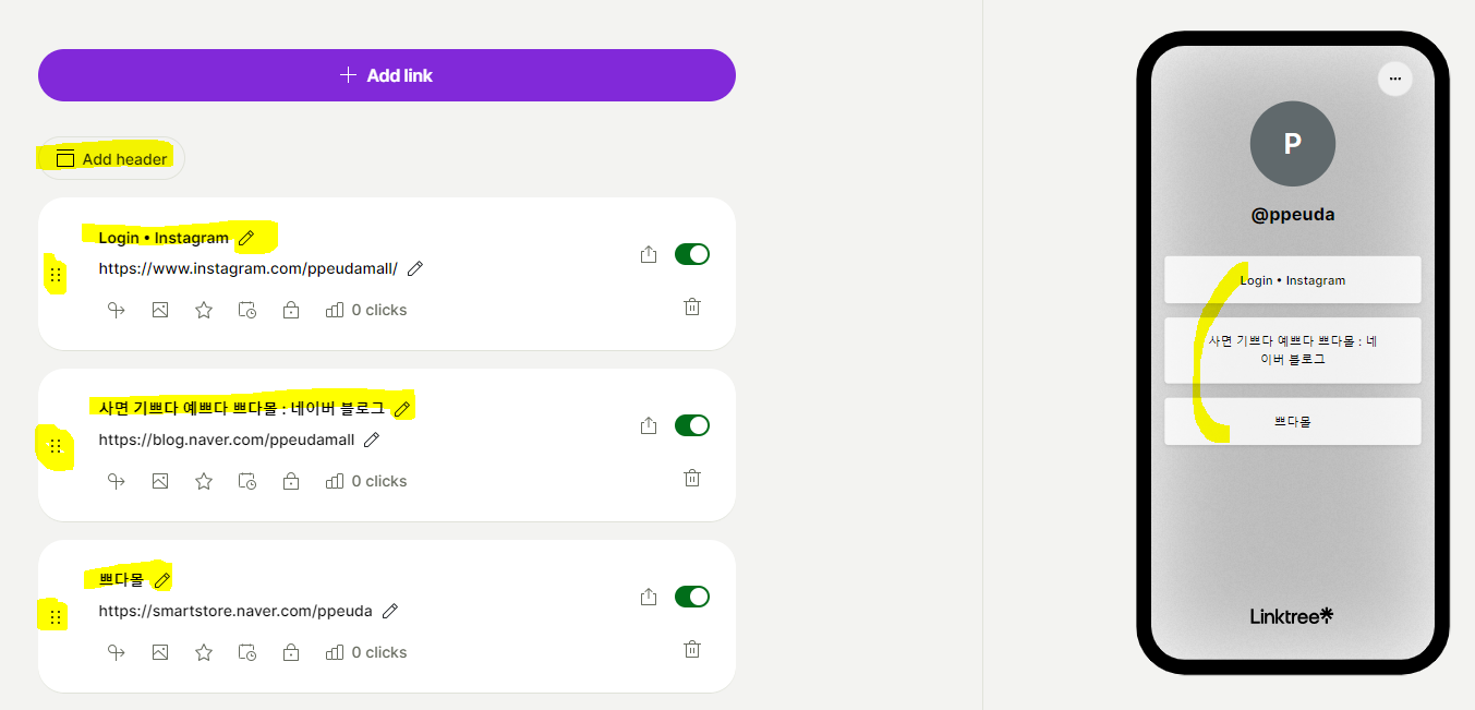 13. 다시 링크트리 사이트로 돌아오면 추가한 링크들이 자동 입력 나열되어 있는 것을 볼 수 있는데요. 맨 위의 Add link를 눌러서 링크를 더 추가할 수도 있고, Add header를 누르면 간단한 항목도 작성할 수 있습니다. 그리고 화면에 보이는 항목 타이틀을 원하는데로 수정해주면 됩니다. 또한 왼쪽의 점 여섯개 찍힌 부분을 클릭해서 움직여서 위 아래 위치 순서 변경 할 수 있습니다.