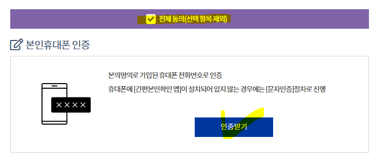 4. 전체 동의 후 휴대폰 인증을 합니다.