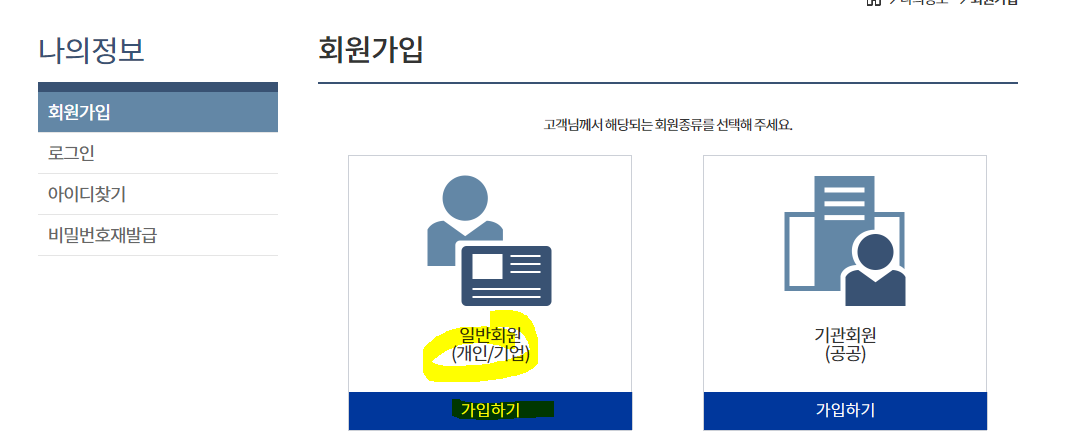 3. 일반회원(개인/기업) 가입하기 클릭합니다.