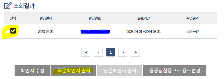 20. 확인서를 체크하고 국문확인서 출력을 클릭 후 인쇄합니다.