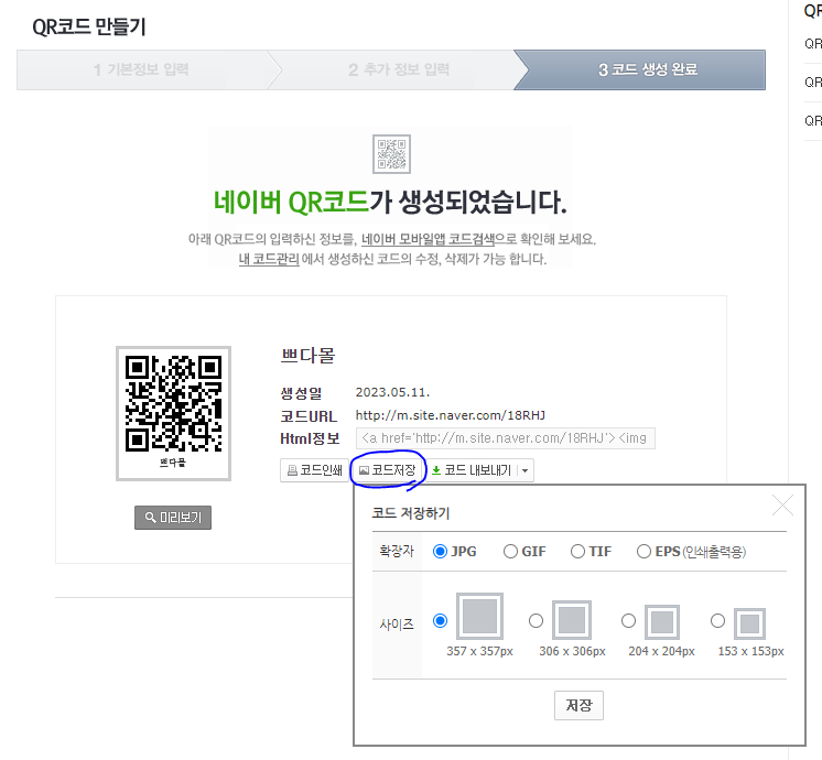 5. 작성 완료를 누르면 QR 코드 생성이 완료 되고, 완성된 QR 코드가 보입니다.