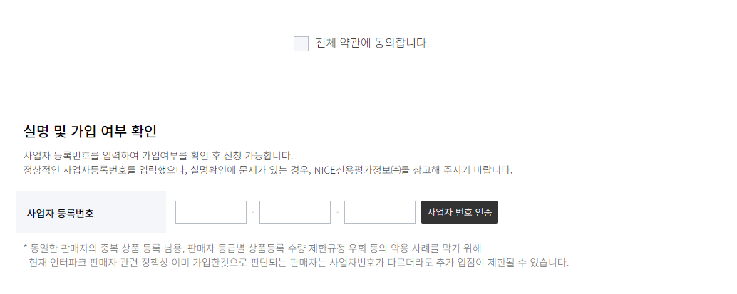 4. 약관에 동의해주고 사업자 번호 인증을 해줍니다.