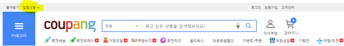 1. 쿠팡에 들어가면 상단 왼쪽에 입점신청이 작은 글씨로 보이는데 마우스를 가져다 대면 오픈마켓, 여행*티켓, 로켓배송, 제휴마케팅이 나옵니다. 그 중 오픈마켓을 클릭해줍니다.