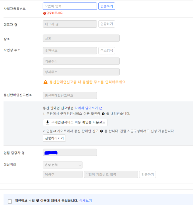 5. 판매자 정보를 우선 입력 해 보겠습니다.