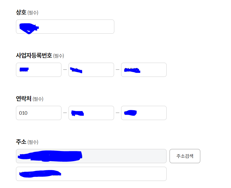 5. 사업자 등록증에 입력된 정보대로 상호명, 사업자 등록 번호, 연락처, 소재지들을 입력합니다.
