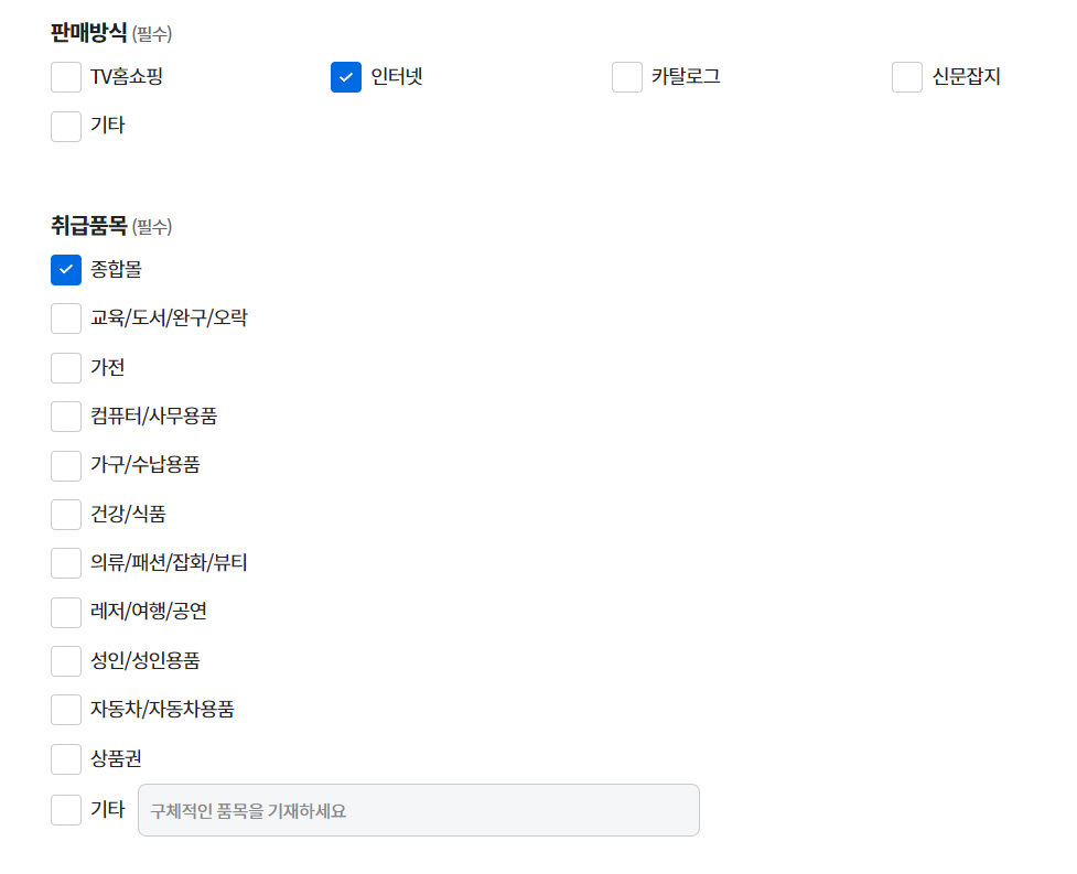 7. 판매 방식은 인터넷, 취급 품목은 원하는 품목을 선택하시고 도메인 이름은 스마트스토어로 입력합니다.