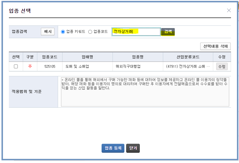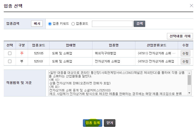 6. 업종선택에서 해외직구를 조회하여 업종코드 525105를 선택해줍니다. 그리고 산업분류코드 47911를 선택 해서 주업종으로 설정해줍니다.