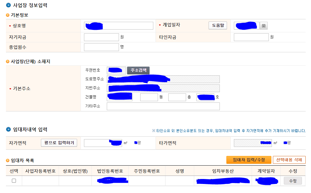 4. 사업장 정보입력란이 나오는데 상호명과 개업일자를 적어주고 사무실 주소를 사업장 소재지로 적어줍니다. 본인소유가 아닌 임차한 사무실 같은 경우 임대차내역을 임대차계약서에 적힌 그대로 적어줍니다.