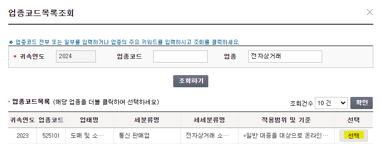 7. 그리고 부업종을 설정하기 위해 업종 선택에서 전자상거래를 검색해서 업종코드 525101를 선택해서 부업종으로 설정해줍니다.