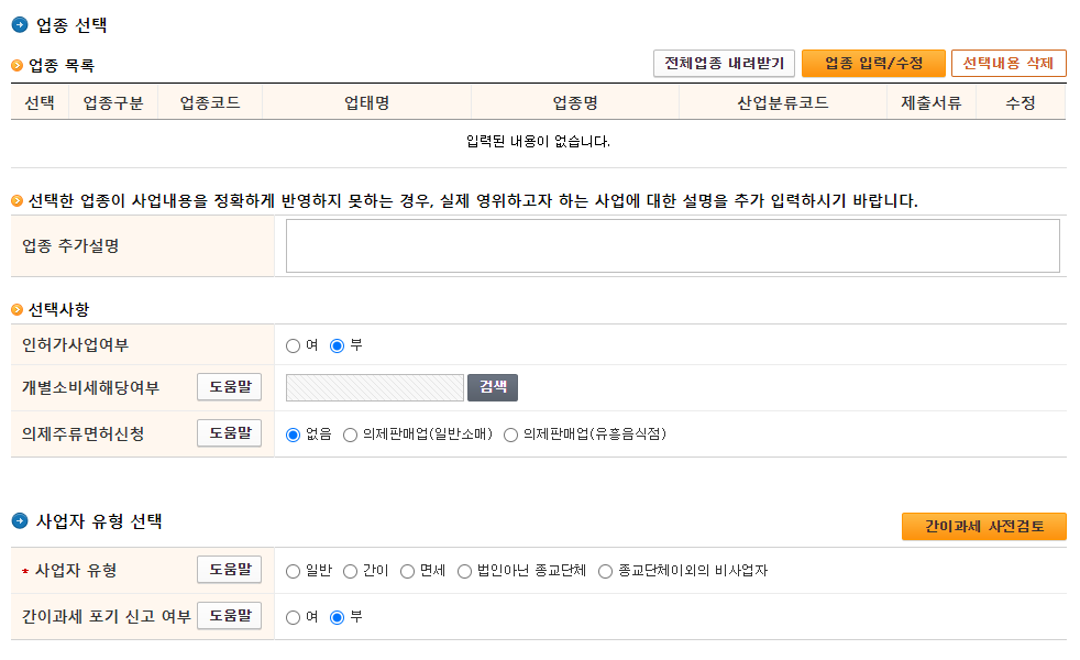 5. 업종 선택을 해야하는데 업종 입력/수정 버튼을 클릭합니다.