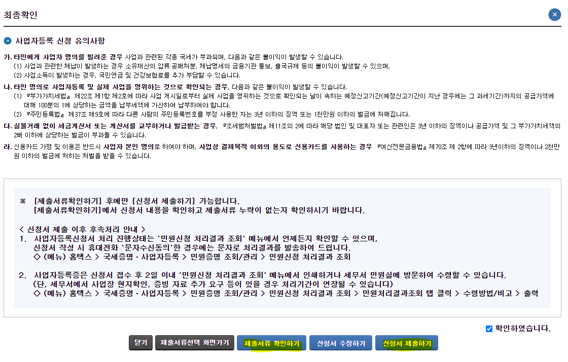 11. 마지막으로 제출서류 확인하기를 클릭하고 최종 제출본을 확인하고 신청서 제출하기를 클릭하면 사업자등록 신청이 완료됩니다. 보통 신청하고 다음날까지 처리가 빨리 되는 편입니다. 처리가 완료되면 사업자등록증이 발급되었다고 문자도 오는데 문자 오면 홈택스에 들어가서 출력하면 됩니다.
