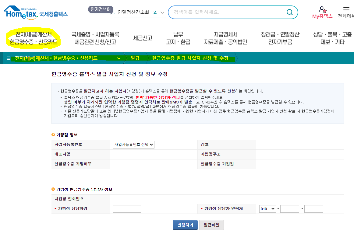 2. 상단에 전자세금계산서 현금영수증 신용카드 버튼을 클릭해서 현금영수증(가맹점) -> 발급 -> 현금영수증 발급 사업자 신청 및 수정을 클릭합니다.