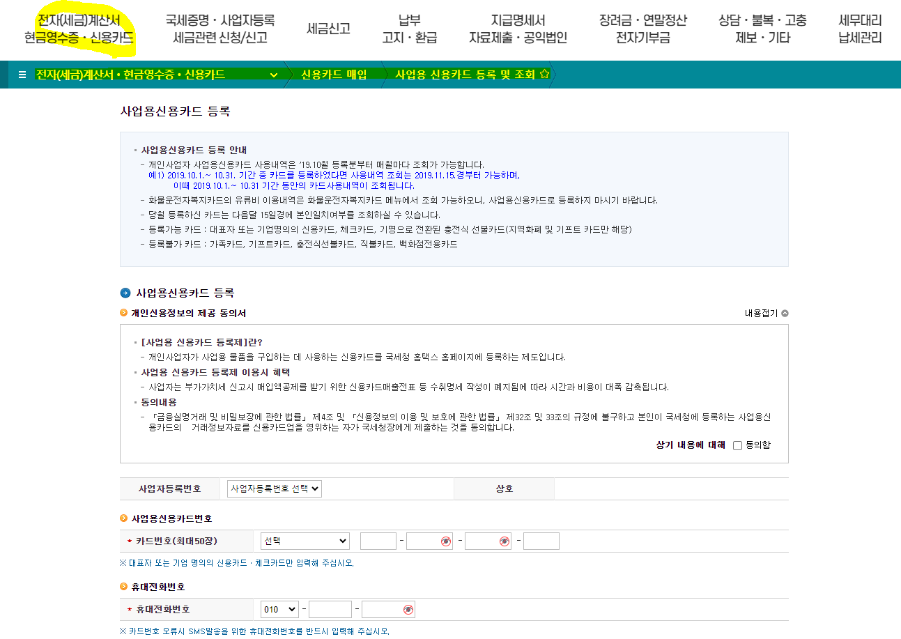 3. 그러면 하기와 같은 화면이 나오는데 정보 제공 동의서 동의를 체크하고 사업용 신용카드번호와 휴대전화 번호를 기입한 뒤 등록접수하기를 누르면 신청이 완료됩니다.